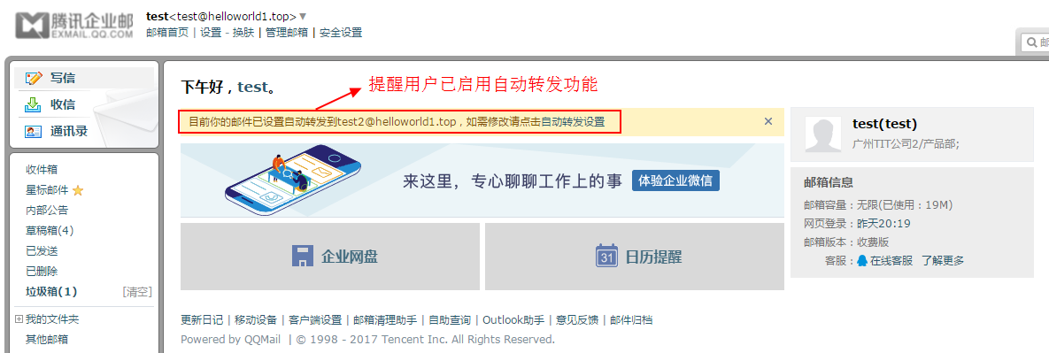 1.?成員郵箱首頁會有黃條提醒用戶已啟用自動轉(zhuǎn)發(fā)功能,如下圖: