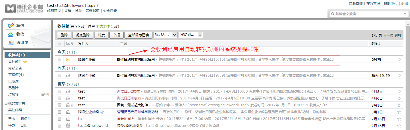 2.成員郵箱賬號會收到一封系統(tǒng)提醒郵件,提醒用戶已啟用自動轉(zhuǎn)發(fā)功能,如下圖: