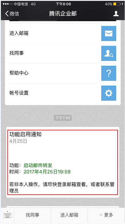 三、自動轉(zhuǎn)發(fā)功能設(shè)置成功后,系統(tǒng)會通過多種渠道通知提醒用戶已啟用自動轉(zhuǎn)發(fā),包括: