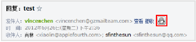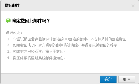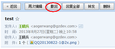 對于已發(fā)送的郵件,可以嘗試進行撤回(僅限發(fā)往QQ郵箱的郵件,并在對方閱讀之前)。如果撤回成功,對于被撤回者而言,看到的郵件將變?yōu)槟衬持黝}的郵件已被撤回的提示,原先的內容和附件將被清除。