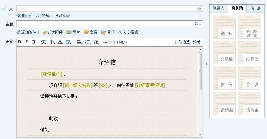 商務函功能預置了常見的企業(yè)公文模板,幫助您撰寫商務郵件。您可以點擊選擇模板類型,郵件正文會自動替換成該商務函,點擊模板文字,輸入文字即可自動替換。