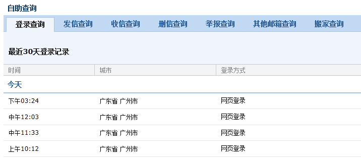 可以自助查詢到登錄、發(fā)信、收信、刪信、舉報、其他郵箱管理、搬家信息