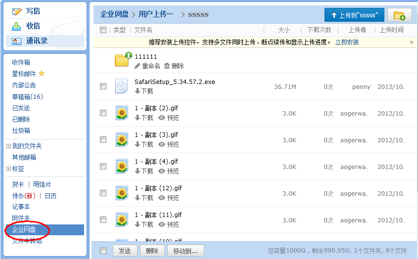 企業(yè)網盤是一種供企業(yè)內部共享文件的存儲服務。員工上傳公司文檔、照片到企業(yè)網盤中,其他企業(yè)員工就能隨時隨地在企業(yè)郵箱中訪問這些文件了。