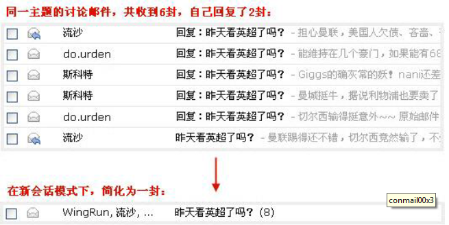 簡化郵件列表,同一主題產生的多封往來郵件,會轉化為一封會話郵件;