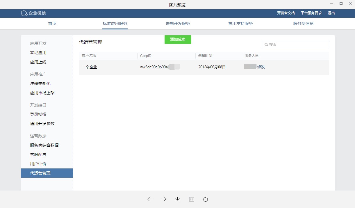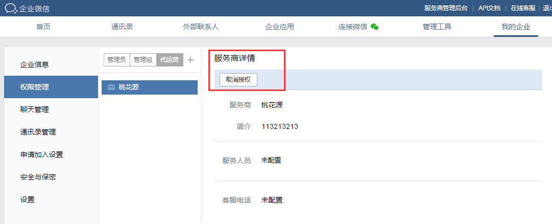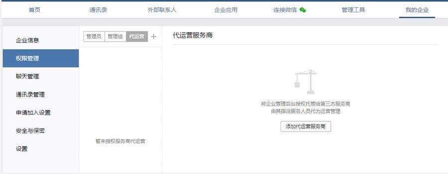 1、創(chuàng)建人可在企業(yè)微信管理后臺我的企業(yè)-權(quán)限管理-代運營中設(shè)置待運營服務(wù)商